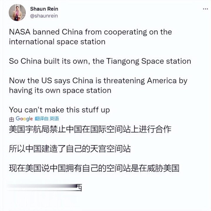 2022年12月4日,美国企业家肖恩·雷恩在领英发帖讽刺此事。他说,美国航空航天局禁中国参与国际空间站,中国就建了天宫。现在美国却说中国有自己的空间站是在威胁美国,这事编都编不出来。